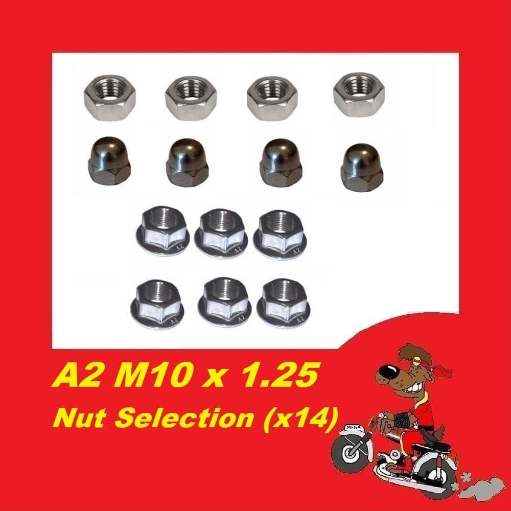 Here we have a pack of 14 hard to find M10 x 1.25 pitch Metric Fine Nuts. These are very useful for restorations and day to day repairs.They will replace your existing damaged/worn out fasteners. This kit contains 6 x Flange nuts (useful for sprockets); 4 x Dome Nuts (useful for shock absorbers) and 4 x Hex nuts (generally used around the bike).