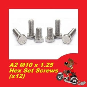 Here we have a pack of A2 Stainless Metric Fine M10 x 1.25 Set Screws. It's a mixed bag of 12 x 12mm-85mm set screws, able to cover a wide range of existing parts on your motorcycle which may need replacing.