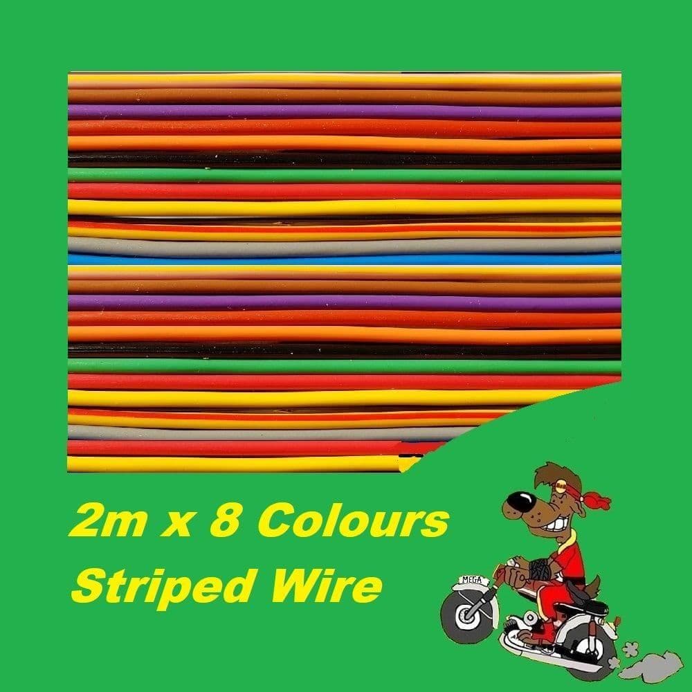 This pack contains 8 x 2m lengths of striped colour wire for your motorcycle. The colours are random. Ideal for loom repairs / indicator / brake lights. Quality thin wall wire.